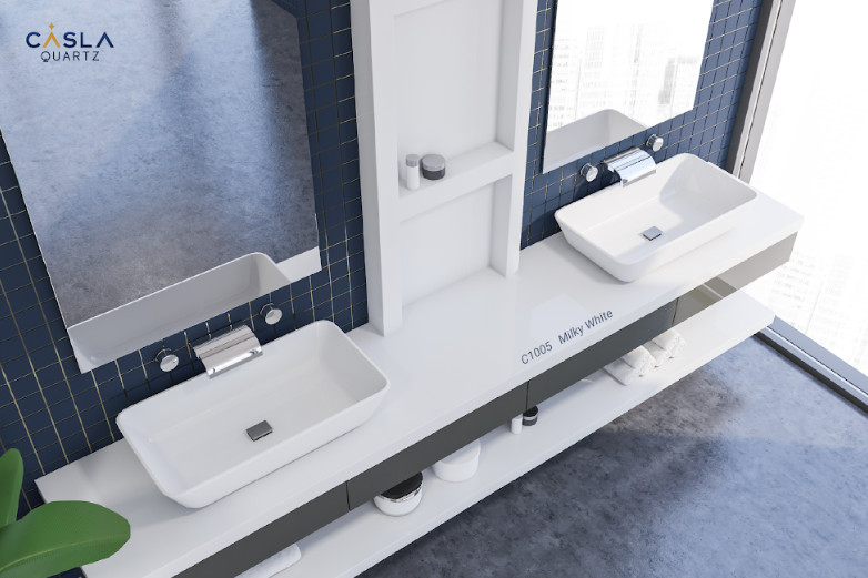 Đá thạch anh nhân tạo Milky White được dùng để ốp mặt chậu rửa tay trong nhà vệ sinh, phòng tắm