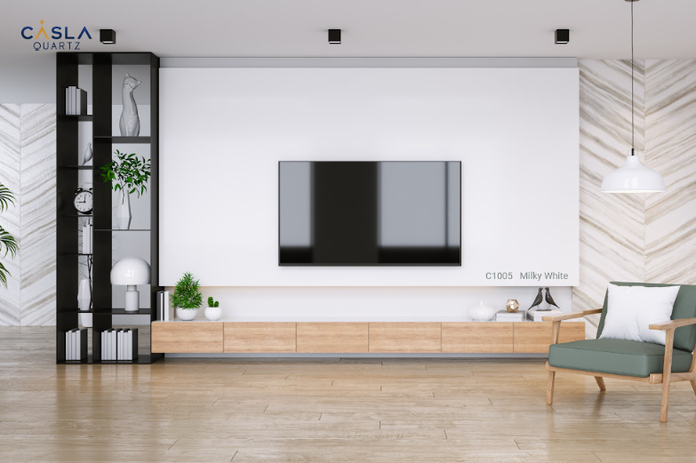 Đá thạch anh nhân tạo Milky White ốp tường phòng khách rất tinh tế, đẹp mắt
